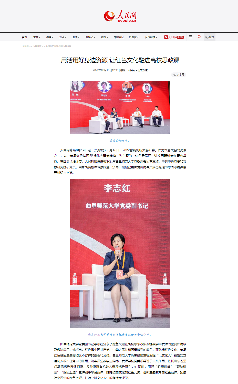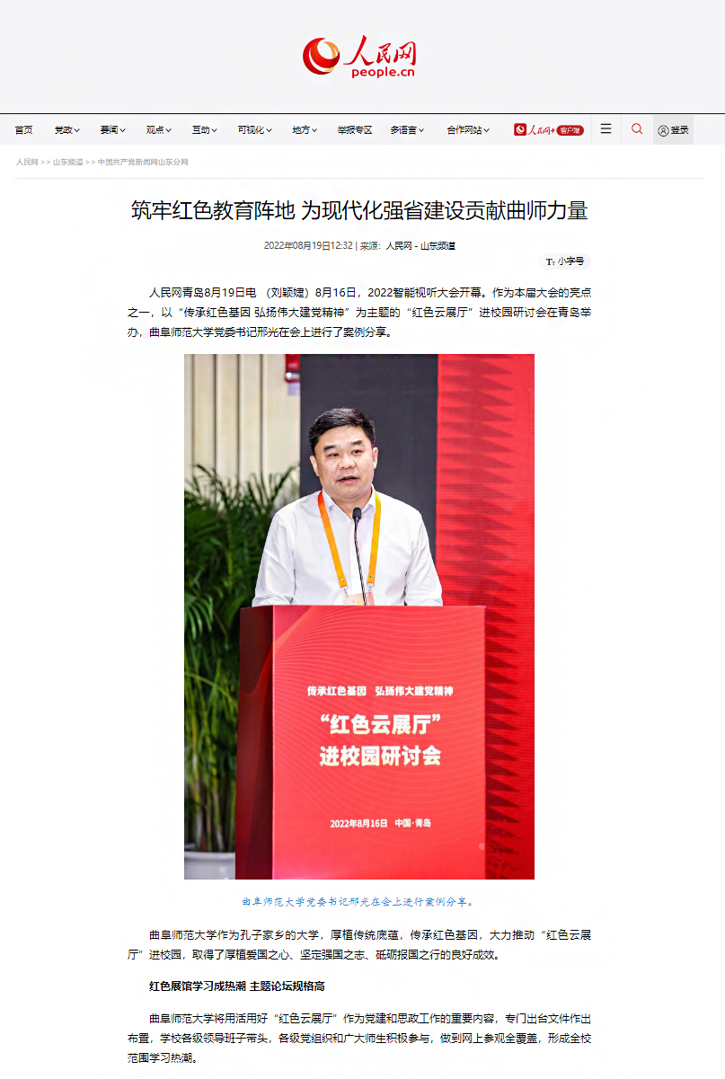 8月16日,由中央网信办、人民日报社、山东省人民政府指导,青岛市人民政府、山东省委网信办、人民网主办的2022智能视听大会开幕。作为本届大会的亮点之一,以“传承红色基因 弘扬伟大建党精神”为主题的“红色云展厅”进校园研讨会在青岛举办,人民网以《筑牢红色教育阵地 为现代化强省建设贡献曲师力量》《用活用好身边资源 让红色文化融进高校思政课》为题报道了开元足球_开元(中国)厚植传统底蕴、传承红色基因、推进立德树人的红色教育开展情况。