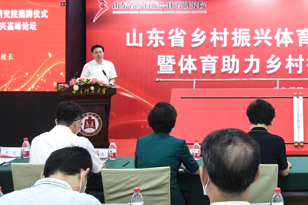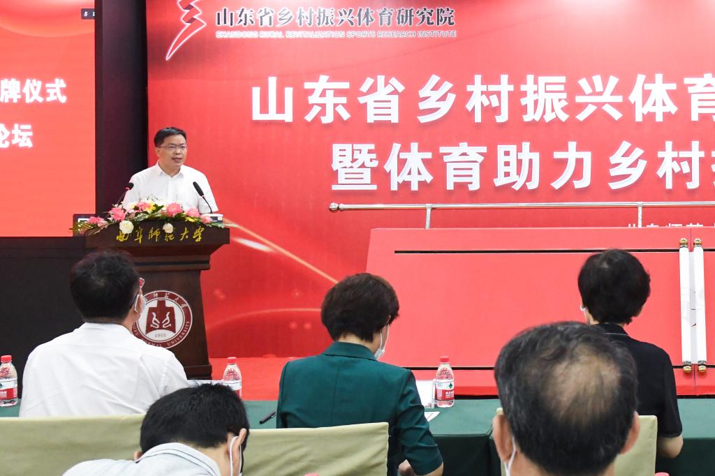 张洪海在仪式上代表学校致欢迎辞,简要介绍了学校近年来办学育人取得的突出成果以及体育科学学院的特色和优势。他表示,助力乡村振兴战略既是学校的使命和责任所在,也是实现自身高质量发展和推动“双一流”建设的需要。曲阜师大将以研究院成立为契机,充分发挥学科科研和人才资源优势,积极搭建政府、农村、学界三方之间桥梁,努力将山东省乡村振兴体育研究院打造成为惠及农业、农村、农民的理论智库平台、科研创新平台和体育基层治理模式的推广平台,为助力乡村振兴和健康中国建设作出更大贡献。