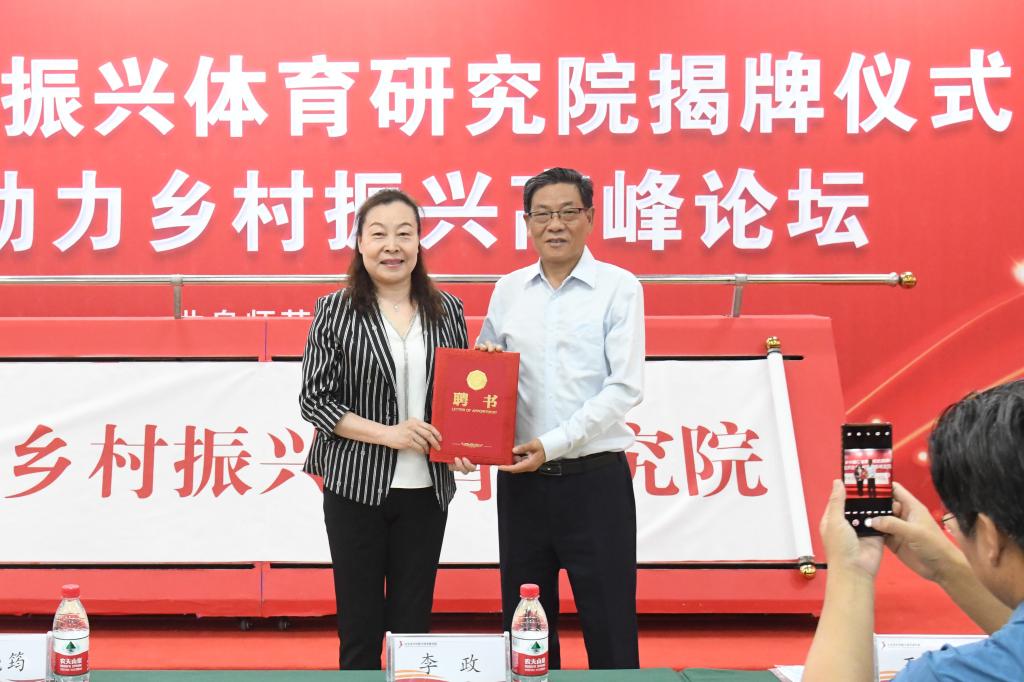 山东省体育局党组书记、局长李政为曹莉教授颁发“山东省乡村振兴体育研究院”院长聘书。