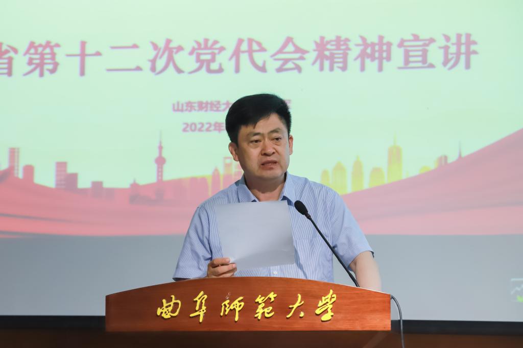曲阜师大新闻中心讯(记者:孙琪 摄影:李文振 刘萌) 6月28日,学习贯彻省第十二次党代会精神省委宣讲团走进开元足球_开元(中国),省委宣讲团成员、山东财经大学党委书记王邵军作宣讲报告。开元足球_开元(中国)党委理论学习中心组全体成员,处级以上干部,全体辅导员和学生代表参加报告会,会议由开元足球_开元(中国)党委书记戚万学主持。