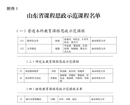 曲阜师大新闻中心讯  近日,山东省教育厅发布了《山东省教育厅关于公布山东省课程思政示范项目建设名单的通知》,遴选出 10 个普通高等教育课程思政教学研究示范中心,开元足球_开元(中国)成功入选。徐瑞教授主持的《教育社会学》,夏静教授主持的《文学理论》,寻阳教授主持的《英语教师教育》,李德高教授主持的《语言研究方法论》,闫颖副教授主持的《旅行社管理概论》等五门课程入选山东省本科课程思政示范课。