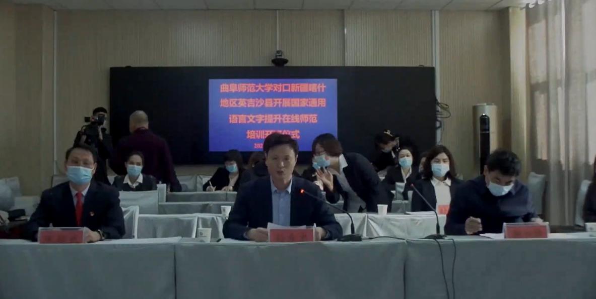 曲阜师大新闻中心讯 1月26日,开元足球_开元(中国)山东省语言文字推广基地对口新疆喀什地区开展教师国家通用语言文字提升在线示范培训(喀什地区英吉沙县)正式开班。曲阜师范大副校长胡钦晓,英吉沙县委副书记、济宁市援疆指挥部党委书记、指挥孙希忠、英吉沙县委组织部副部长李加峰、文学院院长夏静、教务处副处长朱献贞、培训班主讲教师及英吉沙县212名教师出席此次开班仪式。