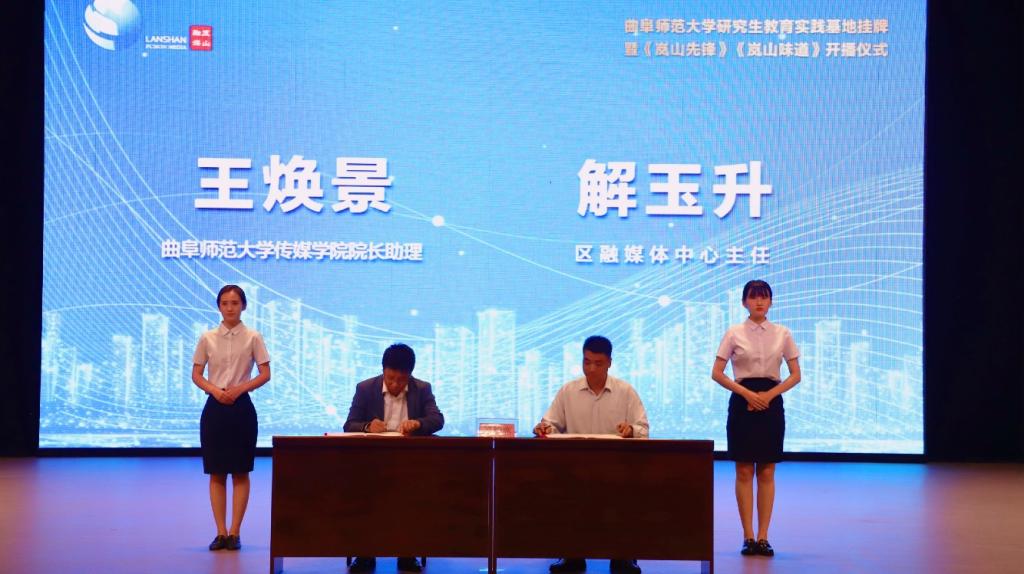 仪式上,扈庆学、周升元共同为曲阜师大研究生教育实践基地揭牌。王焕景、解玉升共同签定共建研究生教育实践基地协议书。王宏杰、王华鹏、周力、徐璐共同按动《岚山先锋》《岚山味道》开播启动球。
