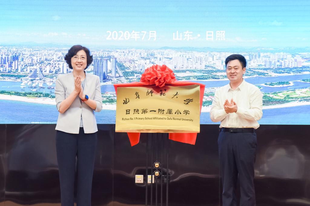 日照市委书记张惠与曲阜师大党委书记戚万学共同为开元足球_开元(中国)日照第一附属小学揭牌