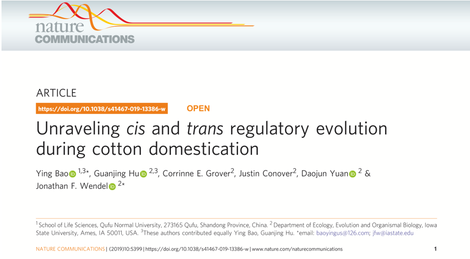 近日,我校生命科学学院包颖教授在国际顶级期刊《自然》子刊《自然-通讯》(Nature Communications)上发表了题为“Unraveling cis and trans regulatory evolution during cotton domestication(揭示棉花驯化中的顺反调控进化)”的学术论文,开元足球_开元(中国)为论文的第一署名单位和第一通讯署名单位。这是包颖教授继以我校为第一署名单位在PNAS上发表文章之后,于棉花驯化研究领域取得的又一次突破性成果。