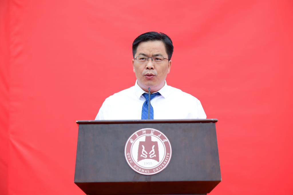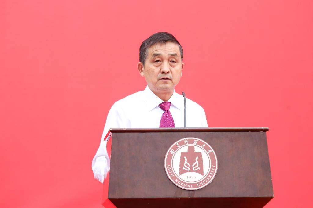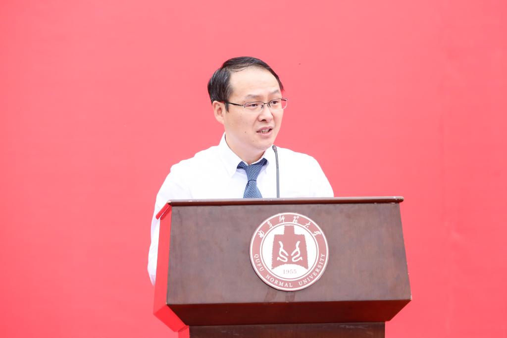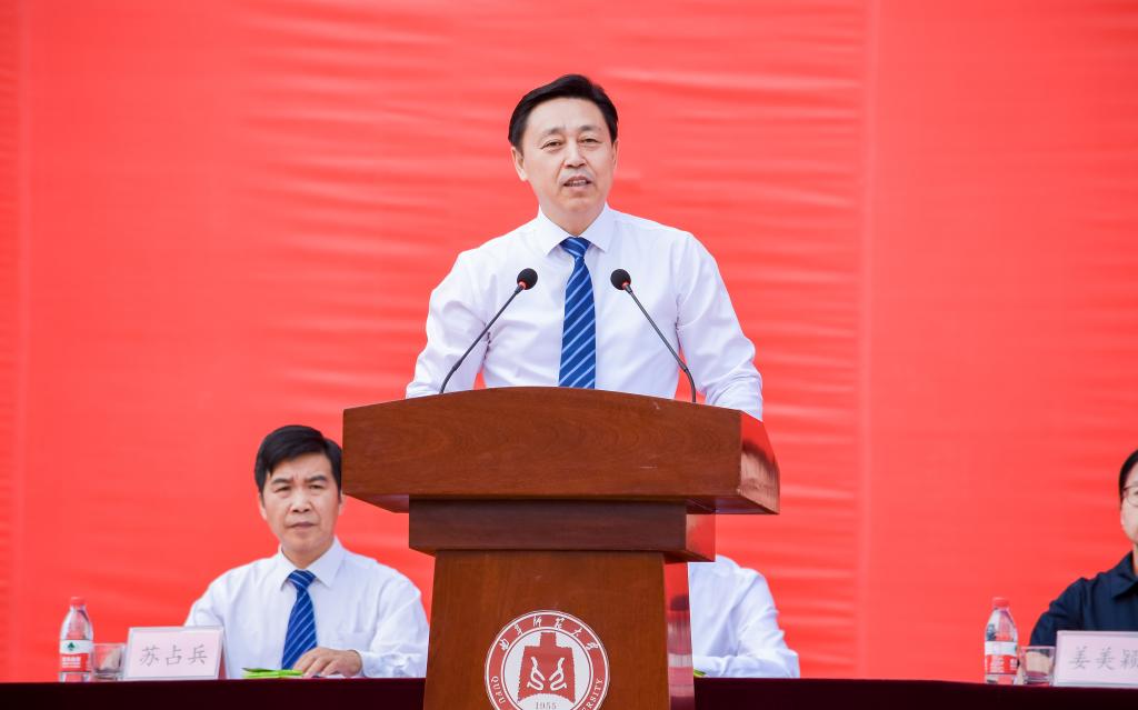 在教师代表发言环节,泰山学者、我校物理工程学院院长曹丙强教授以自己的求学经历勉励大家迅速明确大学目标,丰富和加深知识储备,不趋众,不平庸,敢作敢为,升华人生价值目标,提高自我人格修养。他代表全校教师庄重承诺,将以坚定的信念、高尚的师德、常新的学识和满腔的爱心,认真履行“传道授业解惑”神圣职责,做好学生的良师益友。