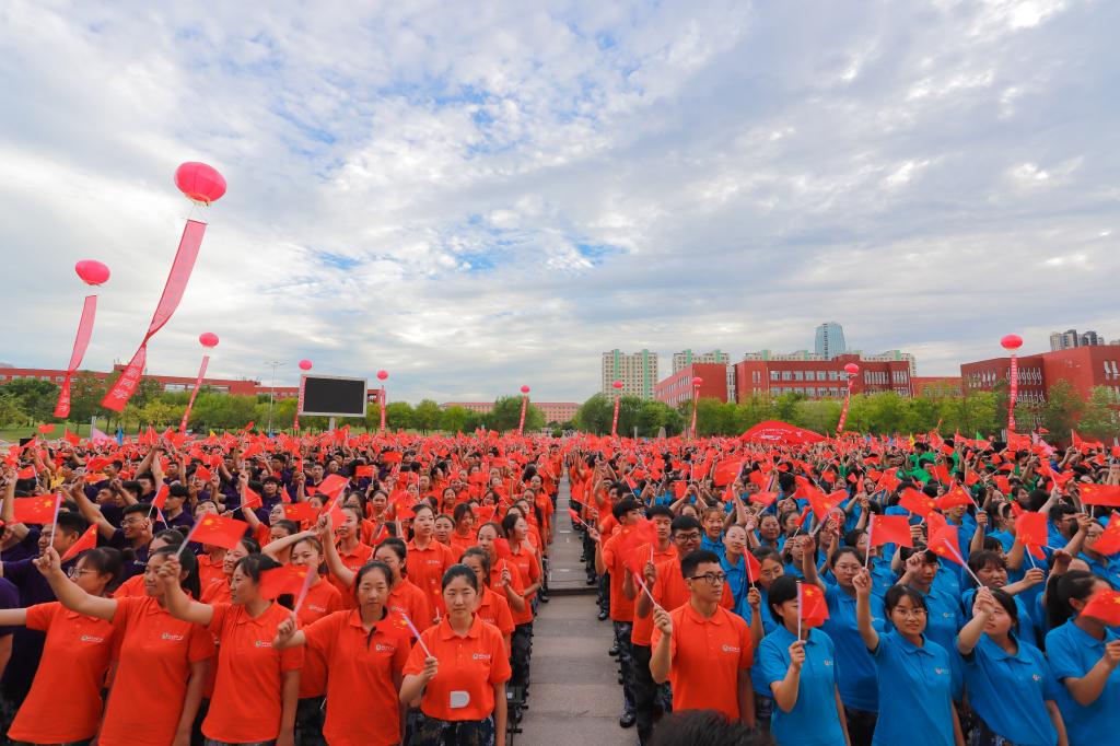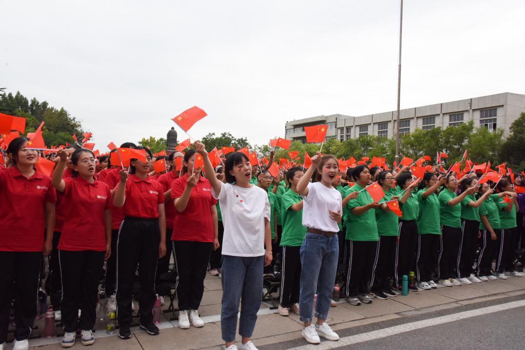 一面校旗催人进。当铿锵有力的鼓点声响起,现场红旗翻动,响起阵阵欢呼声。两校区护旗手迈着矫健的步伐,手举校旗在新生方阵中穿梭。新生们挥舞着手中的五星红旗,与上方的校旗来了一次“亲密接触”,一股深深的家校归属感、荣誉感油然而生,拼搏奋进的笑容洋溢在每一张青春的面庞上。