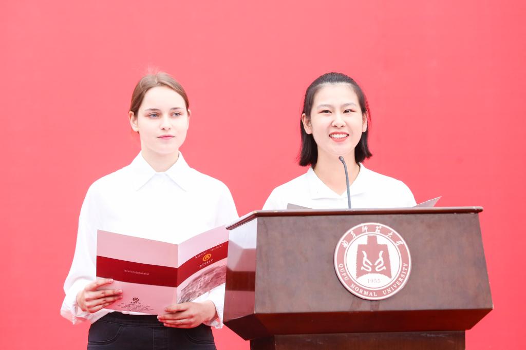 在学生代表发言环节, 2019级本科生代表李佳怡、费祥同学,研究生代表庞茗月同学,俄罗斯留学生代表黄丽娜同学,表达了对未来曲园学习生活的憧憬,对中华传统文化的浓厚兴趣,立志要用知识为青春增色,用担当为青春中国助力,以拼搏为帆,以学识为桨,读懂曲园、读懂时代、读懂中国。