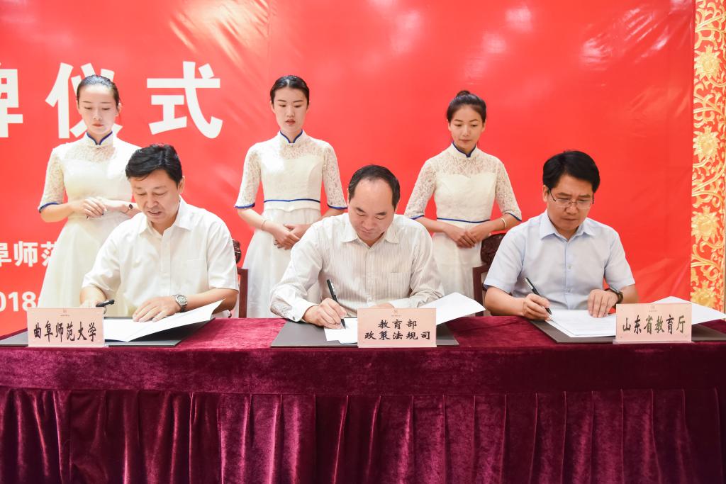 教育部政策法规司司长邓传淮、山东省教育厅厅长邓云锋、校长张洪海共同签署《关于共建青少年法治教育中心的协议》