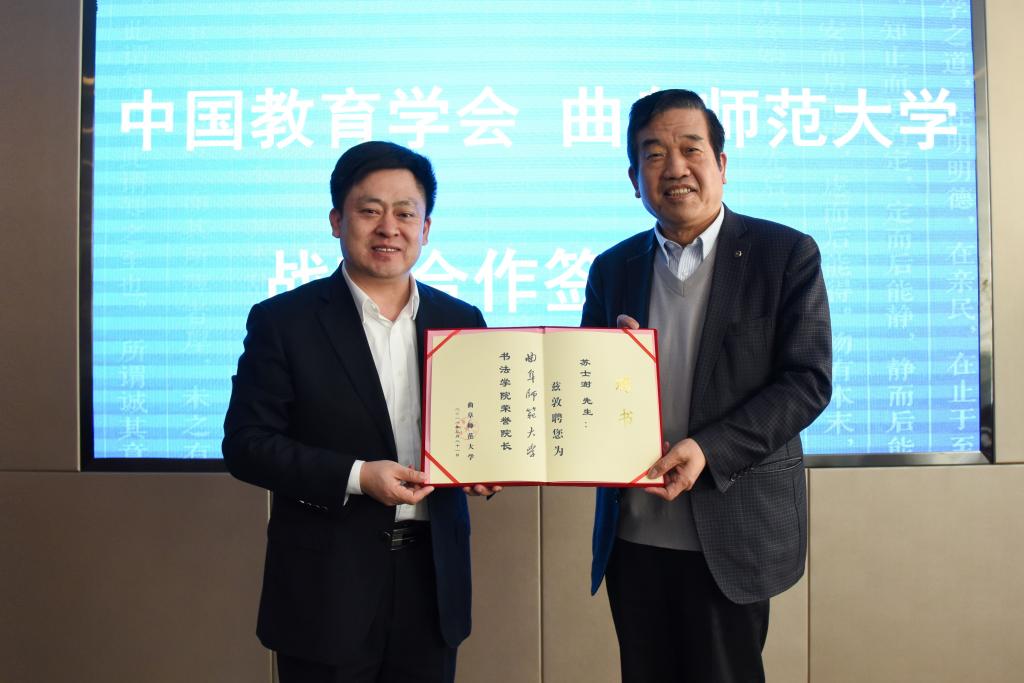 仪式上,我校聘请苏士澍先生担任学校特聘教授、博士生导师、书法学院荣誉院长、中国教师博物馆荣誉馆员,戚万学为苏士澍颁发了聘书。王继锁与中国教育学会副秘书长张东燕代表双方签署了中小学书法教师培训项目战略合作协议。根据协议,我校与中国教育学会将本着“发挥优势、相互促进、长期合作、互利互赢”的原则,共同就中小学书法教育教学标准研制、书法教师培训等方面开展深入合作。