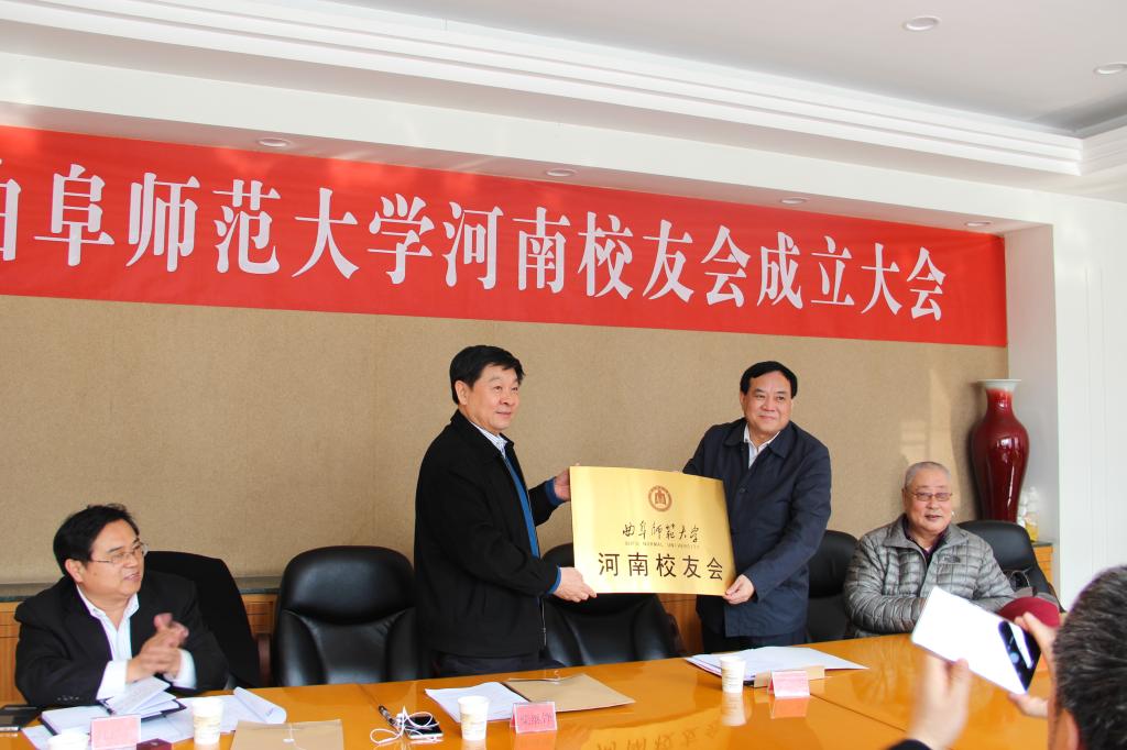 冯冲代表学校向河南校友会授会牌,并赠送书法作品。