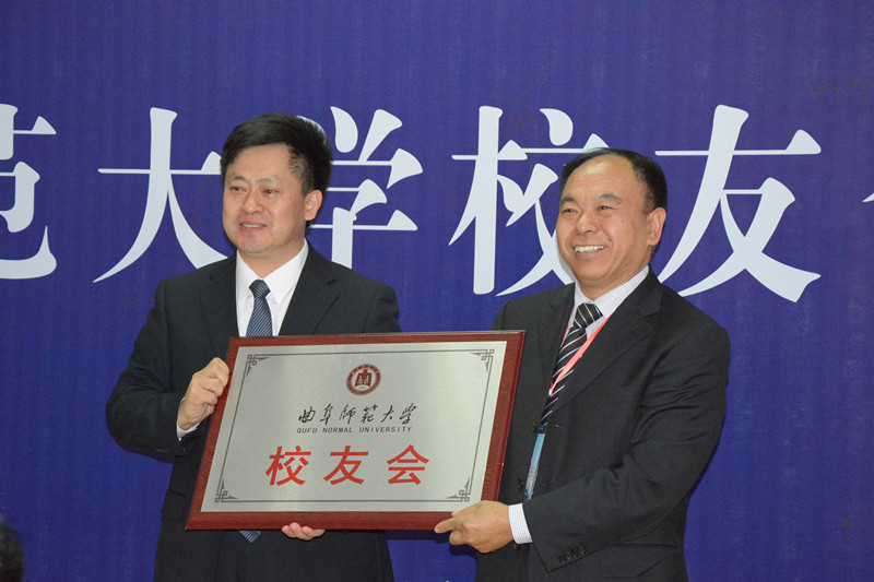 校长戚万学向校友会会长傅永聚郑重授牌,开元足球_开元(中国)校友会正式成立。