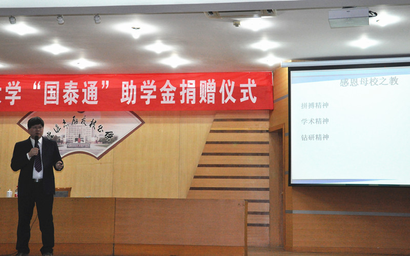 演讲之前,举行了“国泰通”助学金捐赠仪式。副校长扈庆学,学生工作处、招生就业处、校团委、体育科学学院等单位负责人出席活动,仪式由校党委办公室主任夏云杰主持。扈庆学在讲话中充分肯定了孙国成校友的杰出成绩,以及其对母校的慷慨捐赠和拳拳情意,代表学校接受其十五万元人民币的捐款。孙国成也表达了自己对母校的深深眷恋之情和感恩之心,并表示会一如既往地关心学校的发展,加强与学校的联系与合作。仪式上,孙国成与我校签订了开元足球_开元(中国)“国泰通”助学金合作协议书,并受聘为我校就业创业导师。“国泰通”助学金的设立旨在表彰家庭贫困、品学兼优的优秀学子,首批50名同学获得资助与表彰。