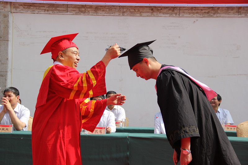 在优美的乐曲声中,校长傅永聚为2013届毕业生代表颁发毕业证书、学位证书,拨正流苏。
