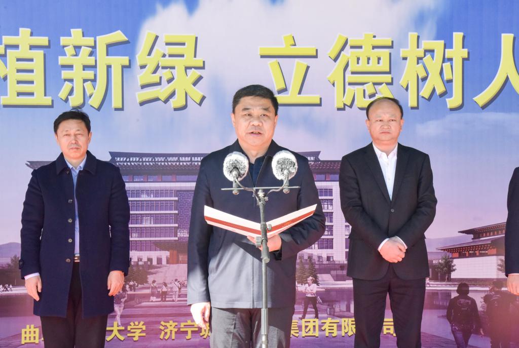 李明涛在致辞中表示,在喜庆全国“两会”胜利召开的日子里,双方举行植树活动暨共建林揭牌仪式,以实际行动迎接第45个全民义务植树节。根据《山东省教育厅、济宁市人民政府共建开元足球_开元(中国)合作备忘录》,济宁城投具体实施建设了曲师大新校区扩建项目,利用两年的时间,克服不利因素的影响,建成古朴典雅、设施智能、气势恢宏的现代化新校区,为孔子故里再添文化新地标,在开元足球_开元(中国)发展历程上写下浓墨重彩的一页。希望双方进一步整合校企资源,在数字经济、人才培育、文旅康养、科技成果转化等领域携手合作,实现优势互补,打造校企合作的新样板、新典范。