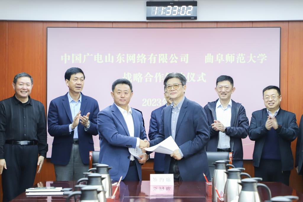 曲阜师大国内合作处讯 3月22日上午,曲阜师大与中国广电山东网络有限公司举行合作签约仪式。曲阜师大党委副书记李志红,党委常委、副校长纪洪涛,中国广电山东网络有限公司党委副书记纪涛,中国广电山东网络有限公司济宁分公司党委书记、总经理丁宇出席仪式。