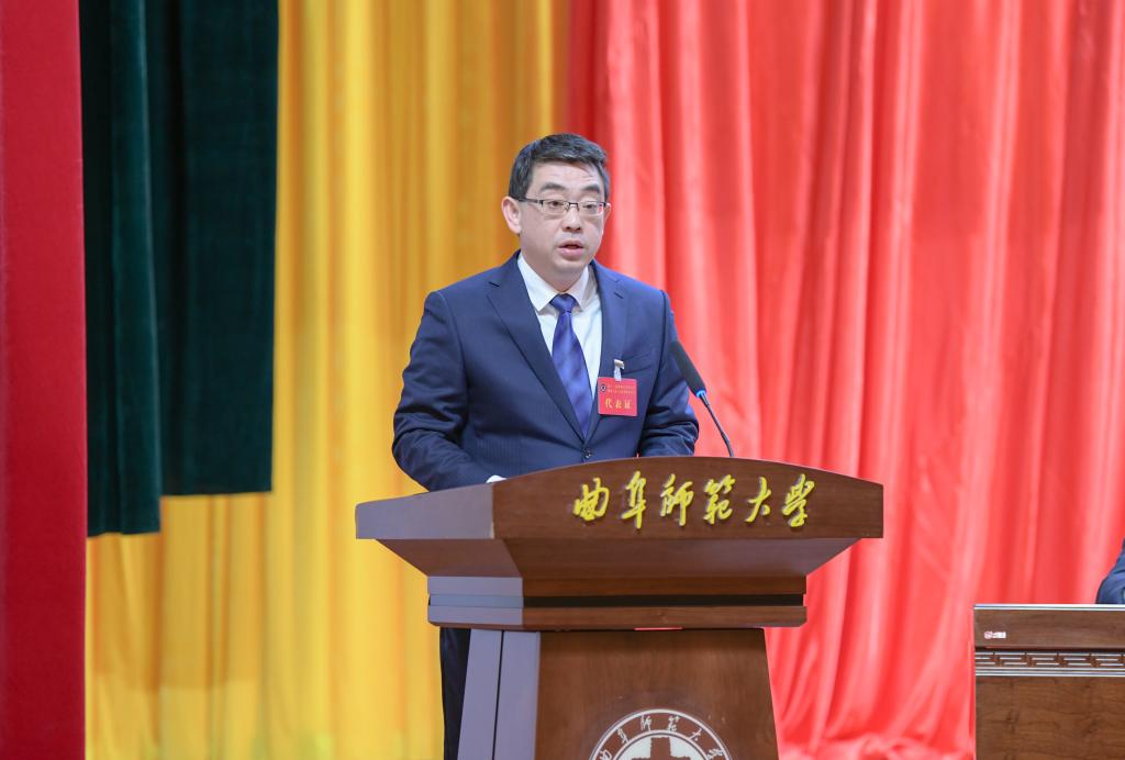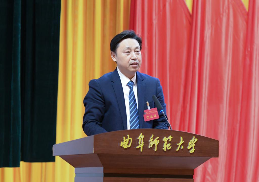 王辉在致辞中代表山东省教育工会向大会的召开表示热烈祝贺,向各位代表和全体教职工致以诚挚问候和崇高敬意。他指出,近年来,在曲阜师大党委的坚强领导下,学校工会紧紧围绕学校中心工作,在推进学校民主政治建设、维护教职工合法权益、完善教育公共服务体系等方面作了大量卓有成效的工作,为我省教育工会工作提供了许多生动事例。