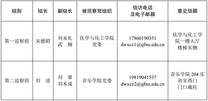 曲阜师大巡察工作办公室讯  根据学校党委巡察工作安排,4月7日、10日,党委第一巡察组、第二巡察组分别进驻化学与化工学院、音乐学院,至此,学校党委第一轮巡察全面展开。