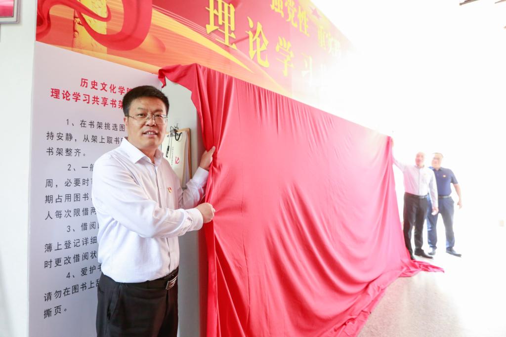 历史文化学院讯  5月24日下午,历史文化学院举行“主题教育理论学习共享书架”启动仪式。学校党委副书记卢国强,党委常委、组织部部长王明科出席仪式并为“主题教育理论学习共享书架”揭幕。