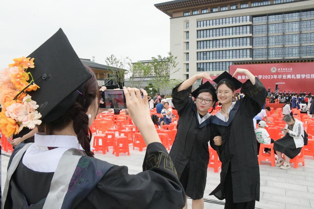 “快看!大屏幕上日照校区的同学们在向我们挥手!”毕业典礼一开始,身在曲阜西校区的同学们就响起一阵欢呼,随即也都纷纷对着现场直播的摄像镜头方向招手致意,希望此刻远在日照校区阳光会场同步举行毕业典礼的老师和同学们也能看见自己。
