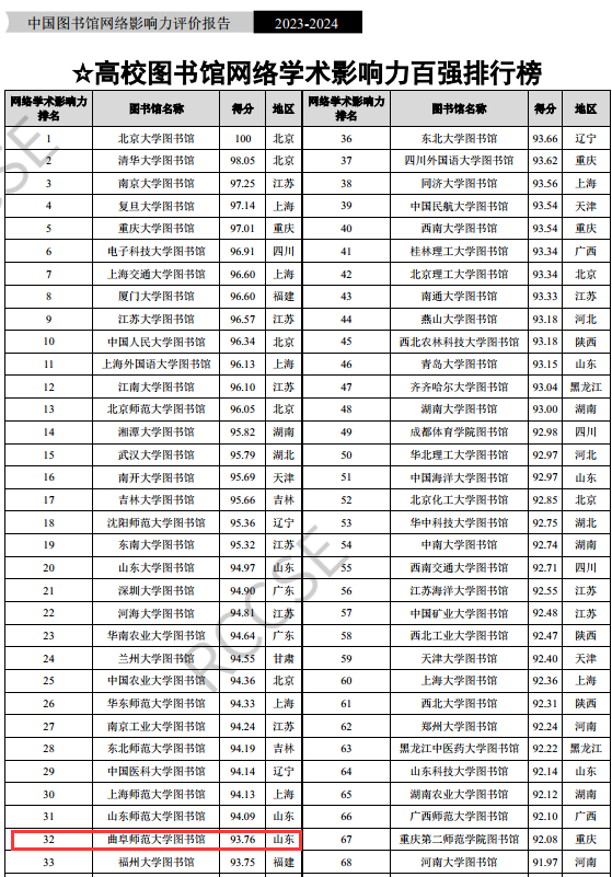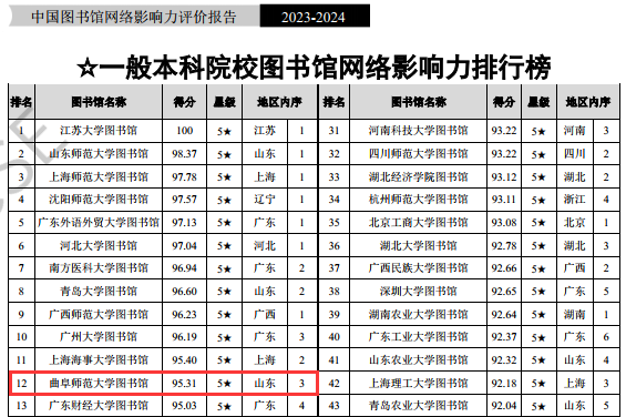 曲阜师大图书馆网络影响力位列全国第86位