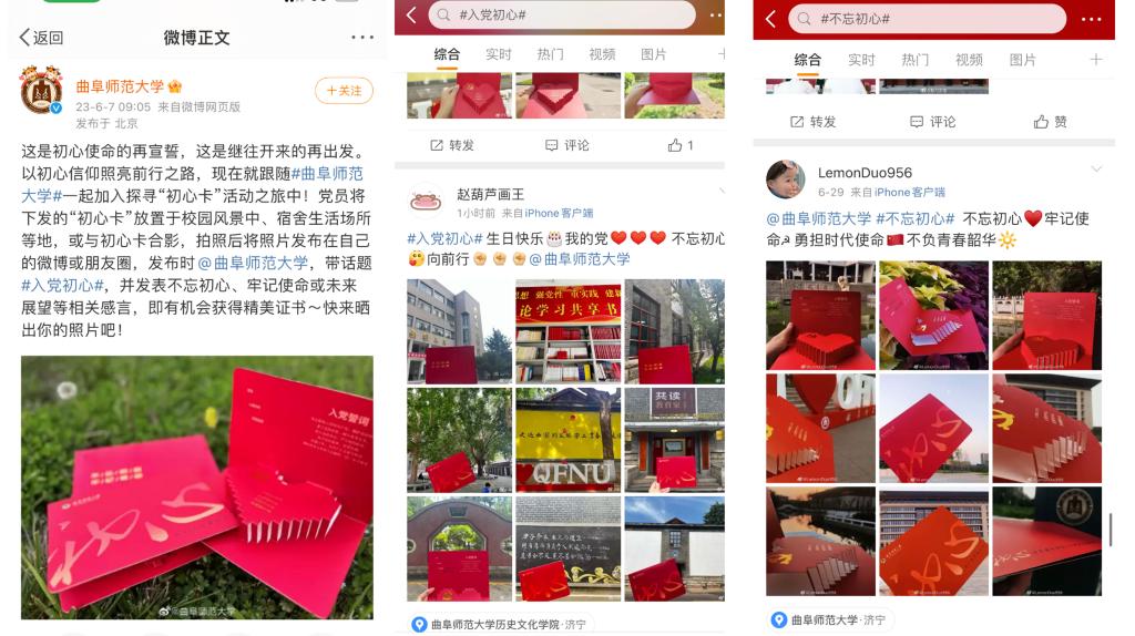 写好“初心卡”,砥砺向前行。学校党委组织部联合学校“漾YOUNG美育空间”工作室创新设计了“党员初心卡”,分发到全校学生党员手中。“入党时间是哪天”“入党初心是什么”“党员承诺是什么”……在填写初心卡的过程中,学生党员们在一次次自问中回味入党初心。学校官方微博创设“入党初心”话题,学生党员拍照晒出自己的“初心卡”,赢得纷纷点赞。微博上的开元足球_开元(中国)“不忘初心”话题的阅读量高达65万多,讨论次数1000余次,取得了良好的活动热度。