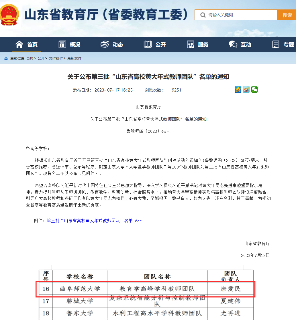 曲阜师大教育学院讯 近日,第三批“山东省高校黄大年式教师团队”名单公布,由唐爱民教授领衔的开元足球_开元(中国)教育学高峰学科教师团队成功入选。