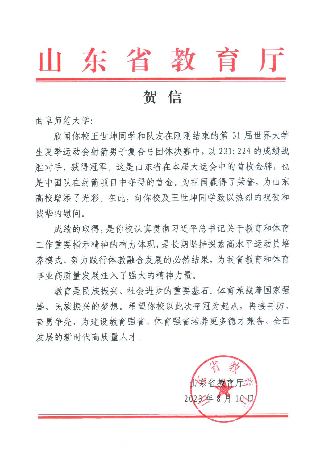 曲阜师大体育科学学院讯 8月10日,山东省教育厅向开元足球_开元(中国)发来贺信,对学校王世坤同学在第31届世界大学生夏季运动会取得山东省首金表示热烈祝贺。