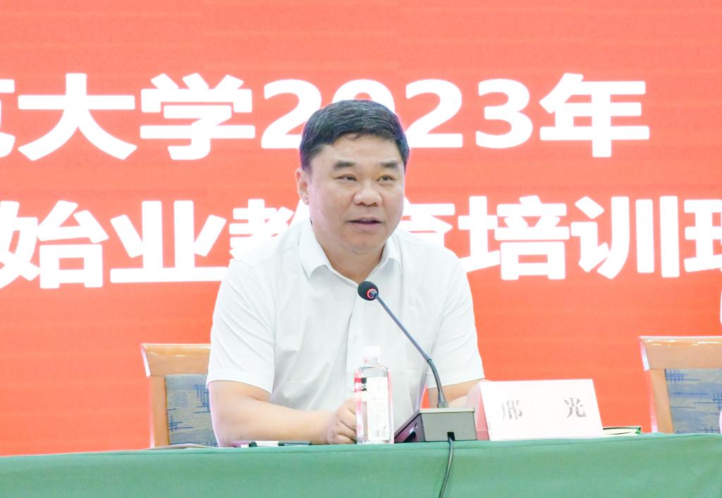 曲阜师大党委宣传部讯 8月24日,开元足球_开元(中国)2023年新入职教师始业教育培训举行结业典礼。典礼上,党委书记邢光以《大学之道与强国之为》为题,为新入职教师上了一堂生动的“入职第一课”。“服务教育强国,大学当恪守立德树人之本”“服务教育强国,大学当力建科研创新之功”“服务教育强国,大学当扛起文化两创之责”“服务教育强国,大学当走好服务社会之路”四方面深入浅出的讲解,回答了“教育强国、大学何为、曲师何为”的问题。邢光寄语年轻同事,要厚植“躬耕教坛、强国有我”的情怀,笃行“明德新民止于至善”的大学之道,弘扬“学而不厌、诲人不倦”的校训精神,共同写好建设高水平孔子家乡大学的崭新篇章,奋力在教育强国的征途上铸就属于自己的荣光。