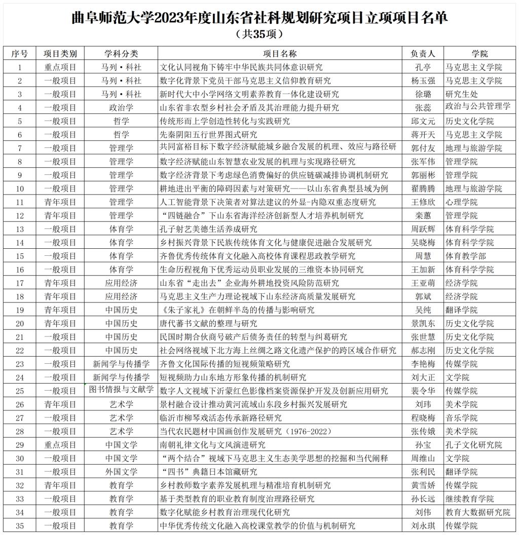 社会科学处讯  8月31日,山东省哲学社会科学工作办公室正式公布了2023年度山东省社科规划研究项目立项名单。曲阜师大获批立项35项,其中,重点项目2项、一般项目25项、青年项目8项,立项总数位列省属高校第三位,一般项目立项数位列省属高校第一位。