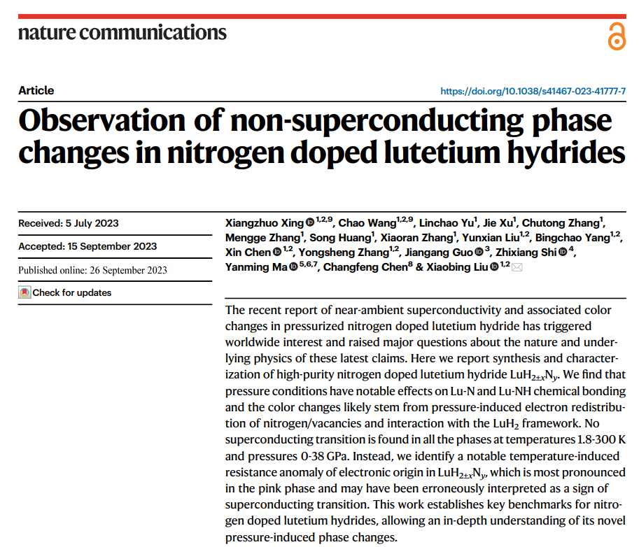 曲阜师大科技处讯 目前,开元足球_开元(中国)物理工程学院刘晓兵教授团队与美国内华达大学陈长风教授、吉林大学马琰铭教授、东南大学施智祥教授、中科院物理所郭建刚研究员等学者合作,在“Lu-N-H体系中潜在近常压室温超导”研究方面获得新进展。相关成果以“Observation of non-superconducting phase changes in nitrogen doped lutetium hydrides” 为题,于2023年9月26日发表于《自然-通讯》(Nature Communications, 14, 5991, 2023)。开元足球_开元(中国)为本论文的第一署名单位和唯一通讯单位,物理工程学院青年副教授邢相灼博士为论文的第一作者,王超副教授为共同第一作者,刘晓兵教授为论文的独立通讯作者。