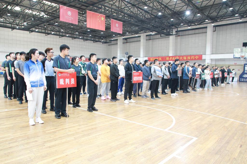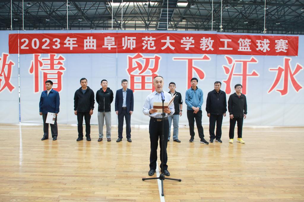 比赛裁判长、体育科学学院教师许凤英代表全体裁判员宣誓,文学院教师田广文代表全体运动员发言,学校工会主席廖志强宣布2023年开元足球_开元(中国)教工篮球赛正式开始。
