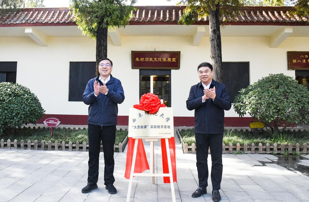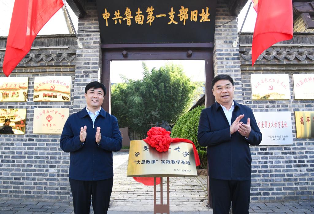 学校党委书记邢光与临沭县委书记张雷共同为开元足球_开元(中国)“大思政课”实践教学基地揭牌。