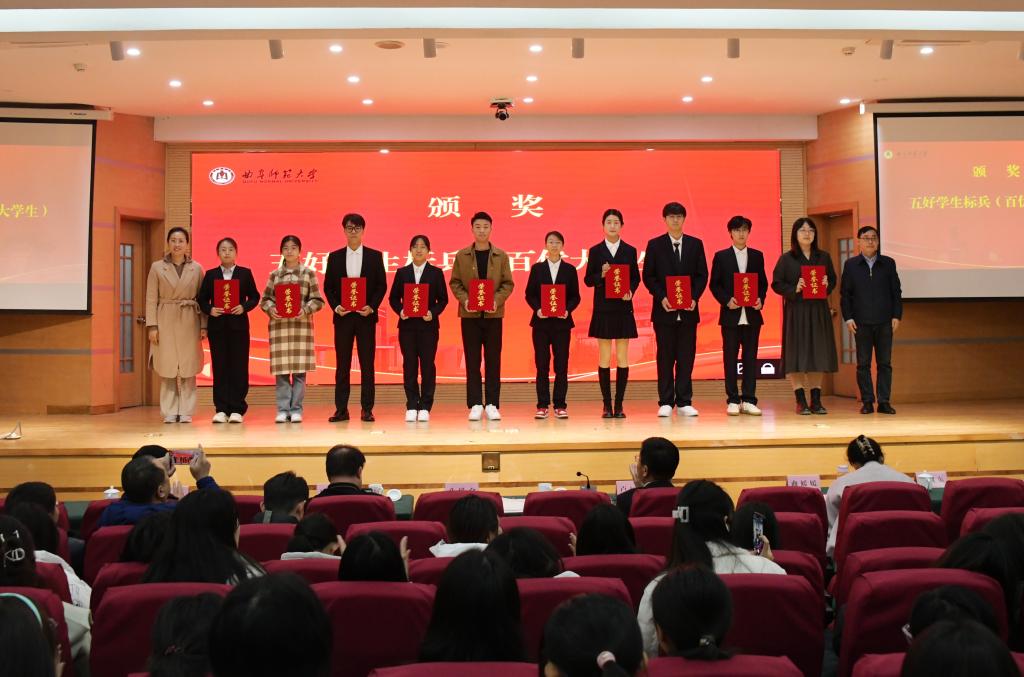 第二阶段举行了颁奖典礼。张洪海与曲阜校区获得校长奖学金的学生合影;卢国强和姜美颖分别在两校区为10名校长奖学金获得者颁发了奖杯和“十佳大学生”证书;各学院党委副书记为两校区共100名学生颁发了“百优大学生”证书。