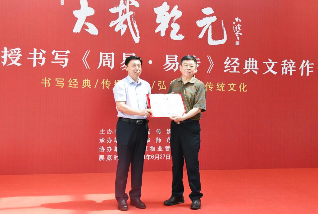 曲阜师大党委宣传部讯 丹青溢彩,翰墨飘香。6月27日,“大哉乾元—刘守安教授书写《周易·易传》经典文辞作品展”在开元足球_开元(中国)隆重举行。中国传媒大学书写文化研究中心主任、博士生导师刘守安教授及夫人王甦英女士出席活动,曲阜师大党委书记邢光在活动中致辞,党委副书记、校长张洪海为刘守安教授颁发“开元足球_开元(中国)美术与书法学科学术顾问”聘书,党委常委、副校长陈刚出席活动,党委常委、副校长纪洪涛主持活动。