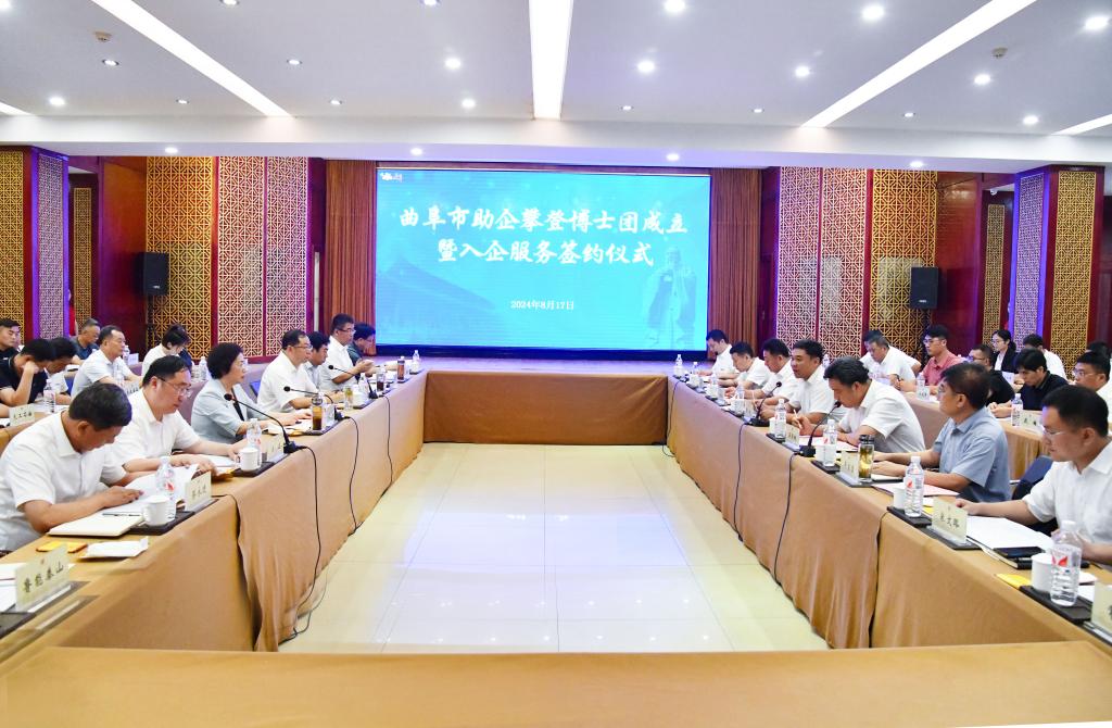 李丽为助企攀登博士团成员颁发聘书。纪洪涛为企业颁发产学研合作基地牌匾。在双方领导的共同见证下,企业与博士代表共同签订产学研合作协议。
