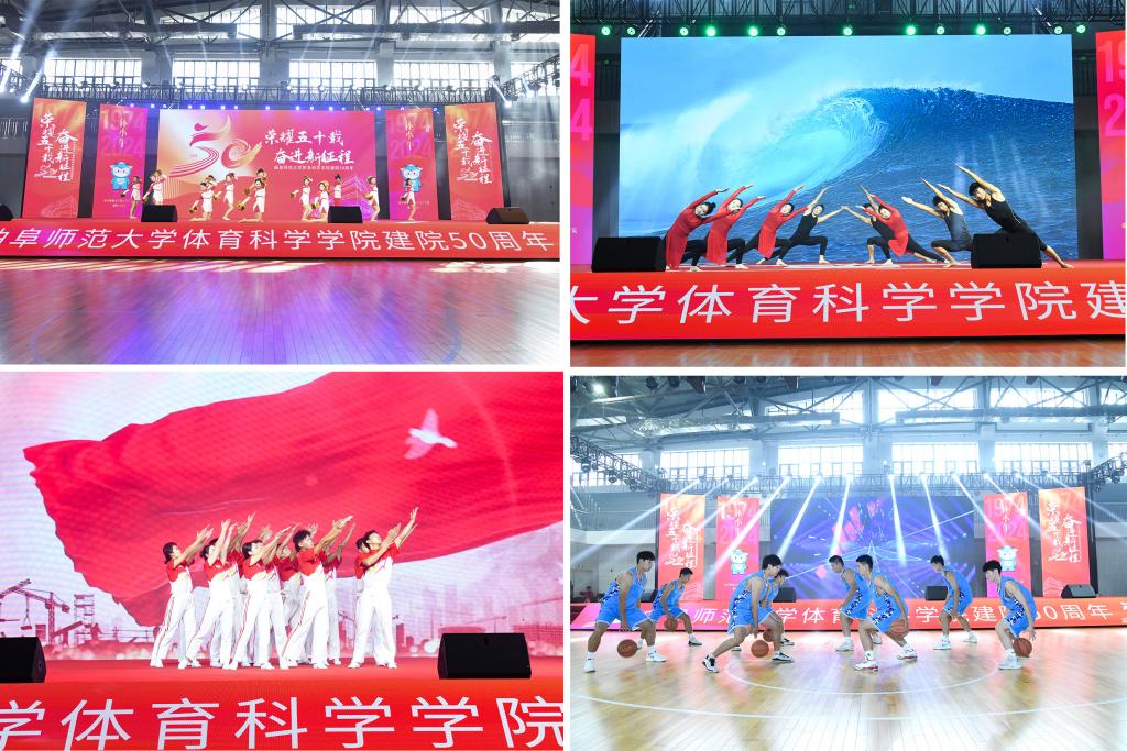 体育科学学院师生和校友进行了教学成果汇报展演,瑜伽、体操、篮球、足球、武术、跳绳、街舞等节目精彩纷呈,师生分享喜悦心情,表达对学校、学院的深情祝福,整个体育馆内洋溢着和谐与热情的氛围。