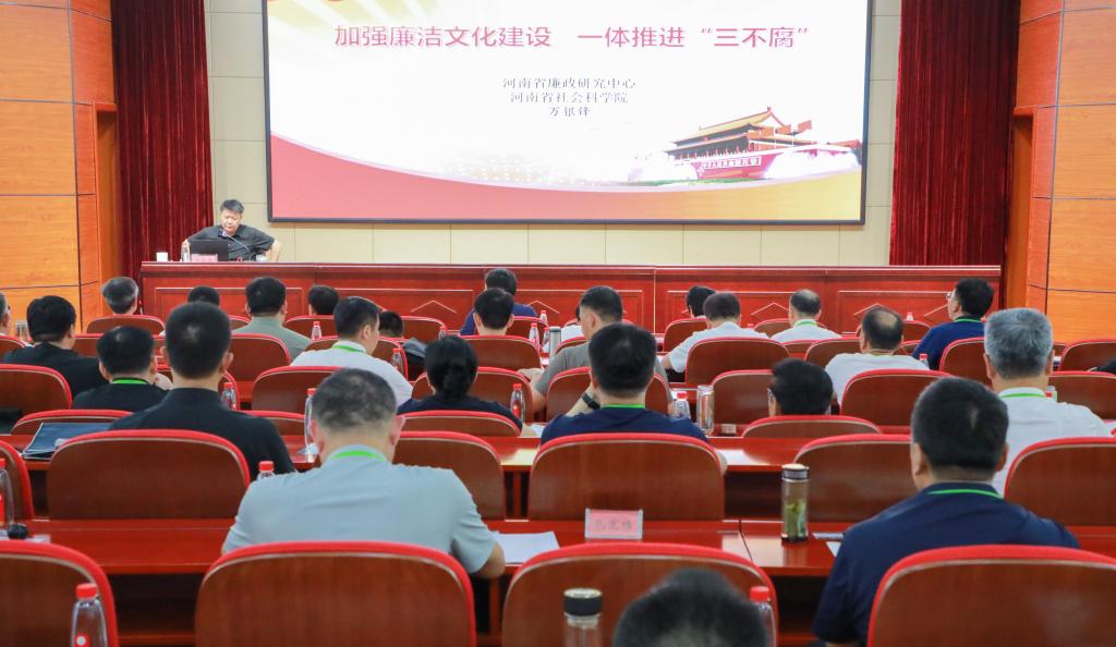 期间,河南省廉政研究中心秘书长、河南省社科院纪检监察研究所所长万银锋为大家作了《加强廉洁文化建设 一体推进“三不腐”》的专题讲座,引导大家深刻领悟中央八项规定精神,提升学习教育实效。