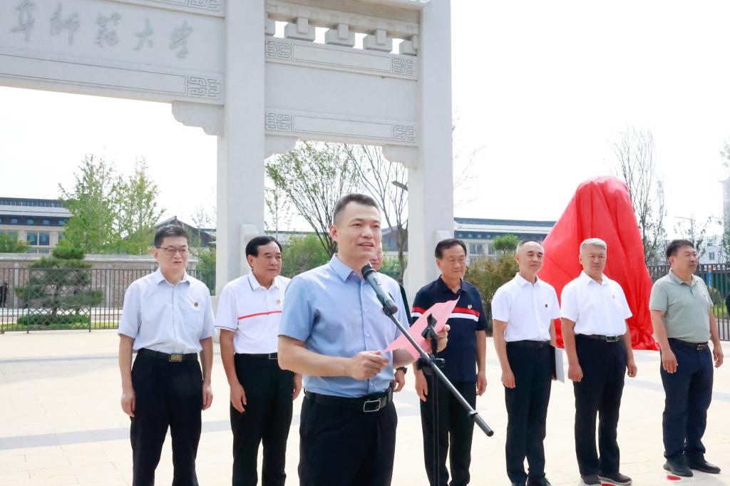 山东理工职业学院院长张隆海代表济宁校友会致辞,他对母校为捐赠仪式作出的周到安排表示感谢,向筹备校庆的师生致以敬意,坦言回到母校感受到了“远客归乡、游子见亲”的亲切与踏实。并深情表述:“一对石狮,挺拔的脊背镌刻七秩岁月的厚重,智慧的双眸凝望母校的薪火相传,爪下的祥云托起对母校的感恩和赞颂,让这份凝结的深情,成为曲园精神的金石见证”。