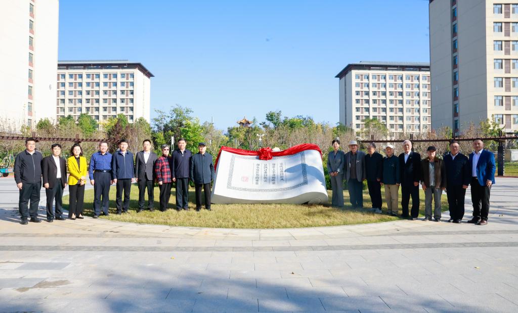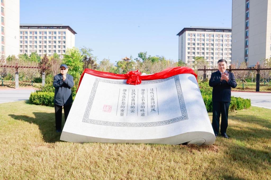 邢光与徐宝庆共同为校园文化景观揭幕。该景观长3米,高1.8米,其造型为长方形书卷状,中间镌刻“让吹过曲园的风都带上书香的味道,让飘过曲园的云都承载思想的重量”,寓意物质载体与精神象征的完美融合,既是对学校良好教风学风的阐释,亦是对师生思想传承与创新的永恒期许。
