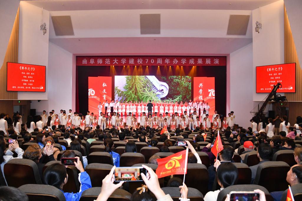 第三篇章“木铎远振·拓新篇”以音乐剧《孔夫子》主题歌,传递出曲园人对文化传承与创新的深刻思索,舞蹈《鼓·舞》生动演绎了曲园人的文化自信,由退休老教师、音乐学院青年学子和曲阜师大附属小学合唱团共同唱响的校歌《犁牛之子》,奏响木铎远振、开拓未来的时代强音,将整场演出推向高潮。