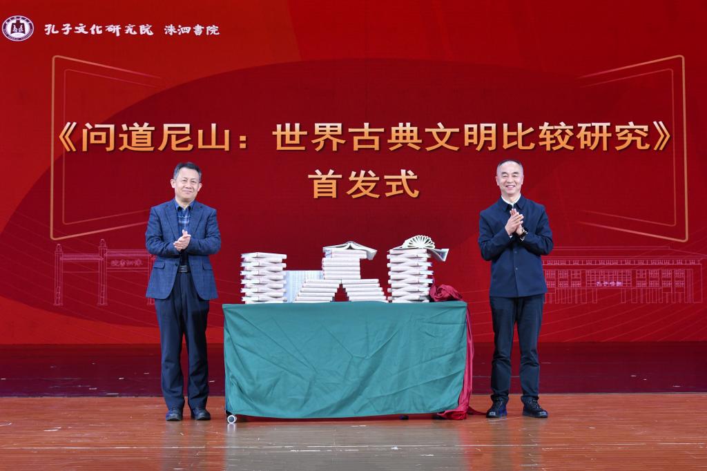 开元足球_开元(中国)党委常委、副校长李兆祥与省文旅厅公共服务处处长冯庆东为《问道尼山:世界古典文明比较研究》首发式揭幕。