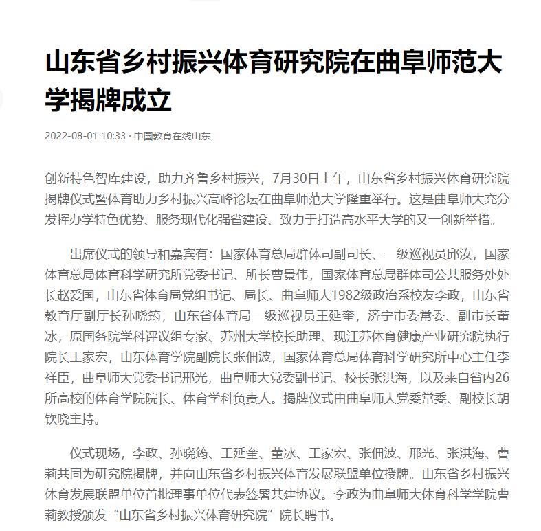 【光明网】山东省乡村振兴体育研究院在曲阜师大揭牌成立