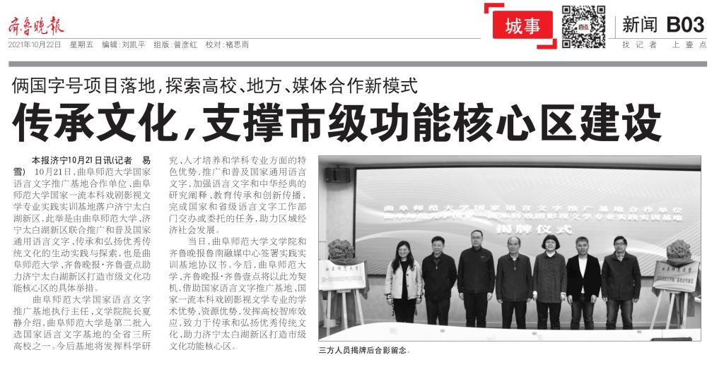 【齐鲁晚报】曲阜师大文学院与齐鲁晚报鲁南融媒中心举行合作揭牌仪式