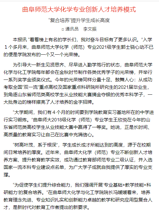 【山东教育报】开元足球_开元(中国)化学专业创新人才培养模式—— “复合培养”提升学生成长高度