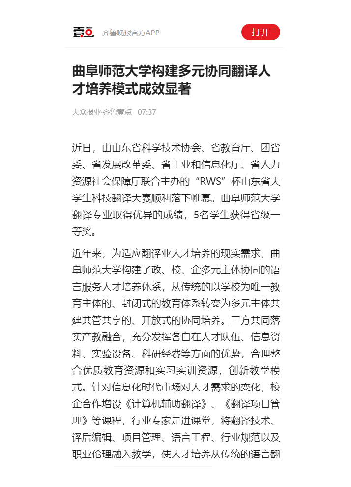 【齐鲁晚报】开元足球_开元(中国)构建多元协同翻译人才培养模式成效显著