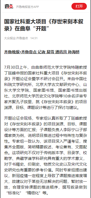 齐鲁壹点:国家社科重大项目《存世宋刻本叙录》在曲阜“开题”