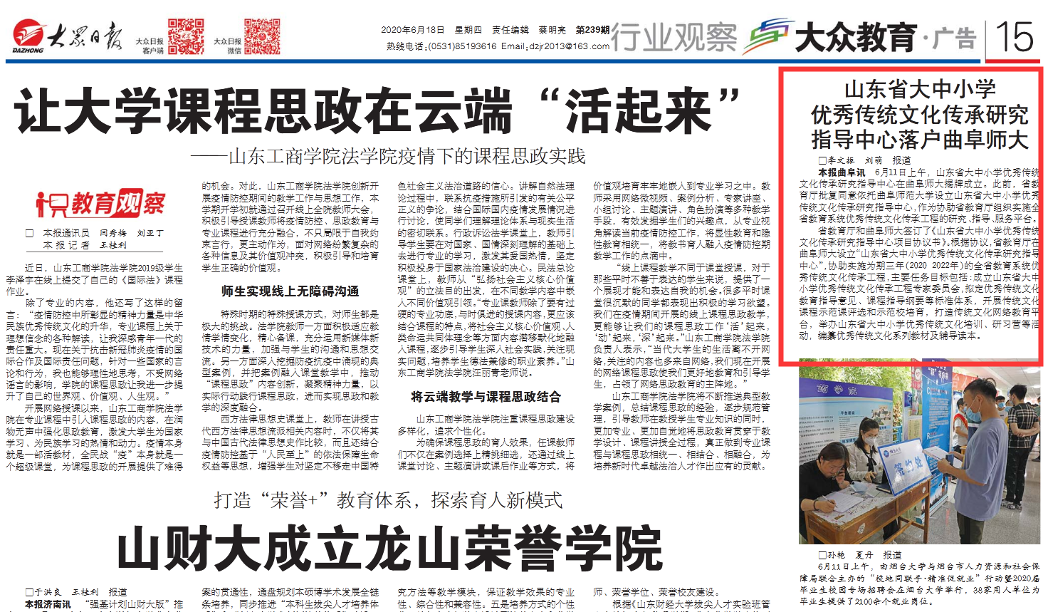 大众日报:山东省大中小学优秀传统文化传承研究指导中心落户曲阜师大