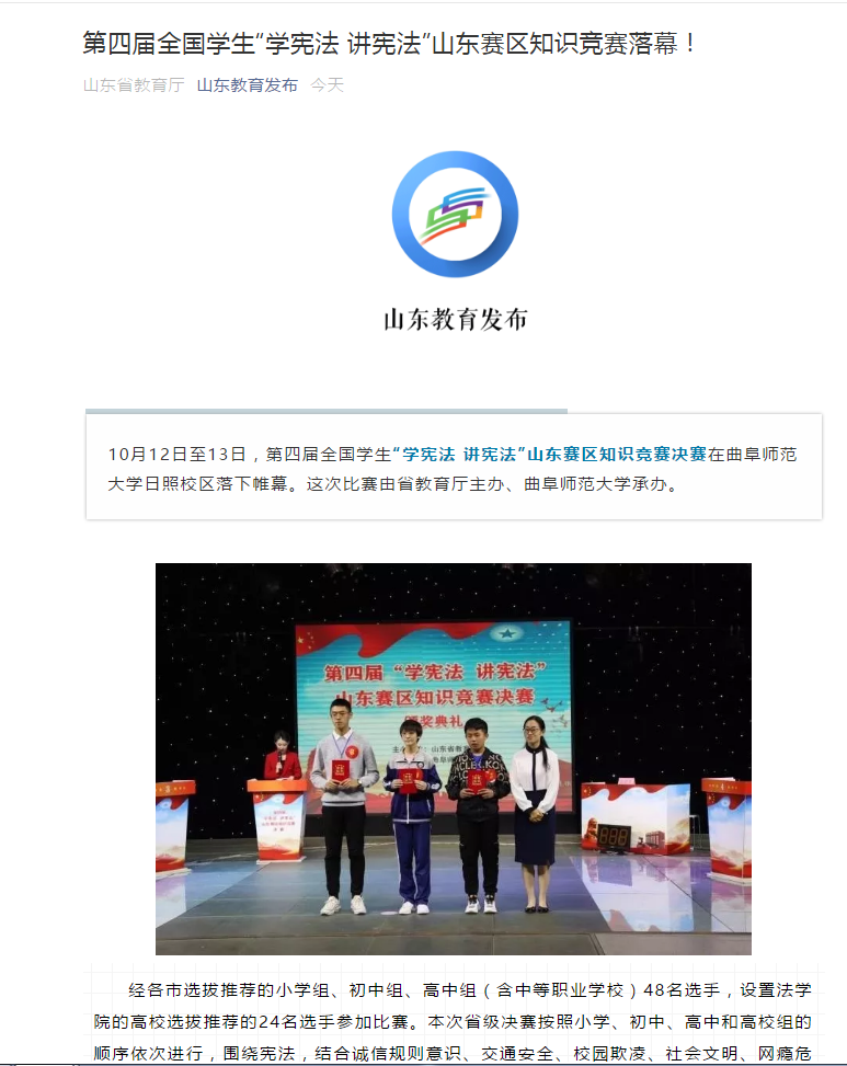 山东省教育厅:第四届全国学生“学宪法 讲宪法”山东赛区知识竞赛在曲阜师大落幕