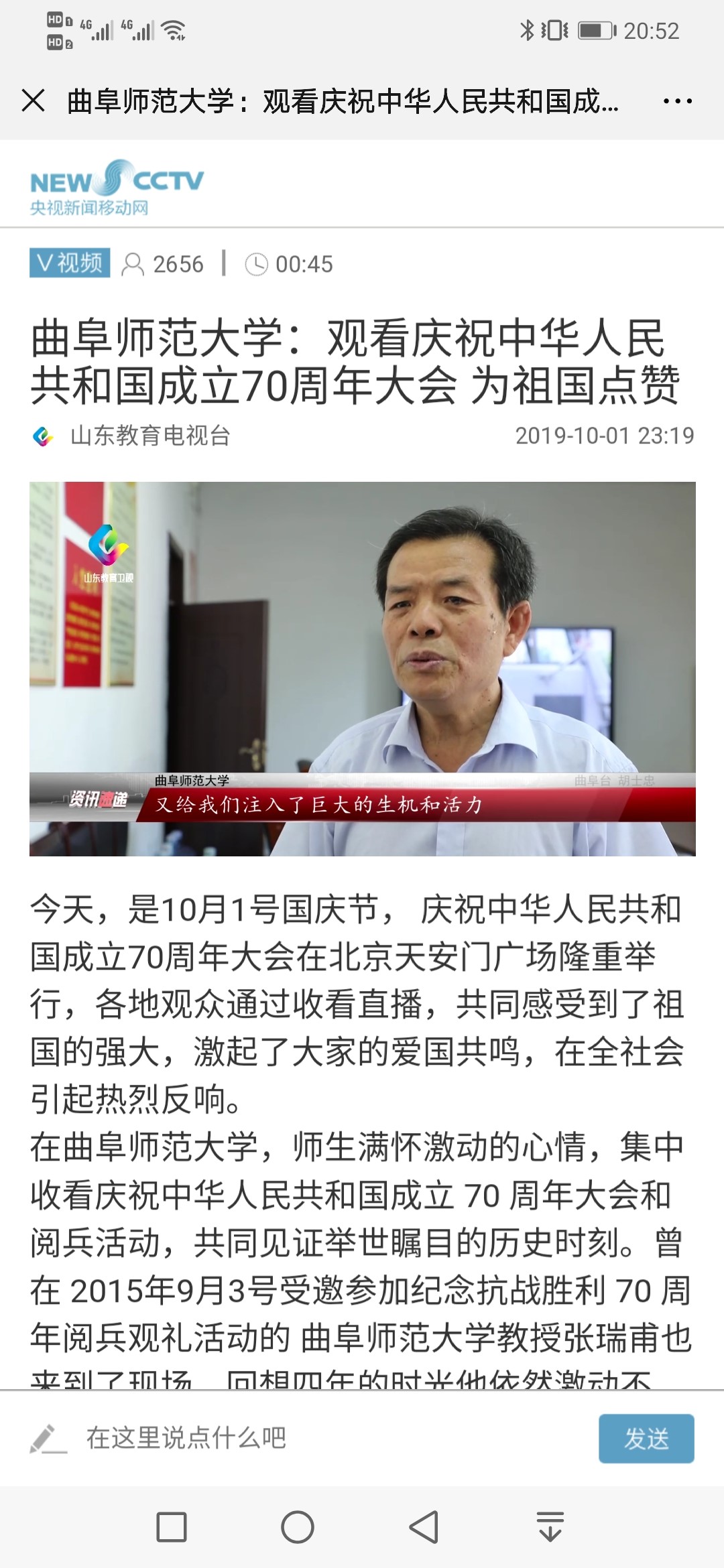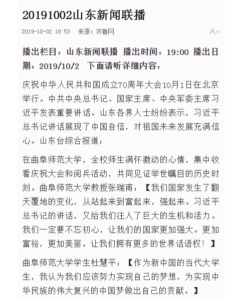 山东教育新闻:曲师大师生观看庆祝中华人民共和国成立70周年庆祝大会